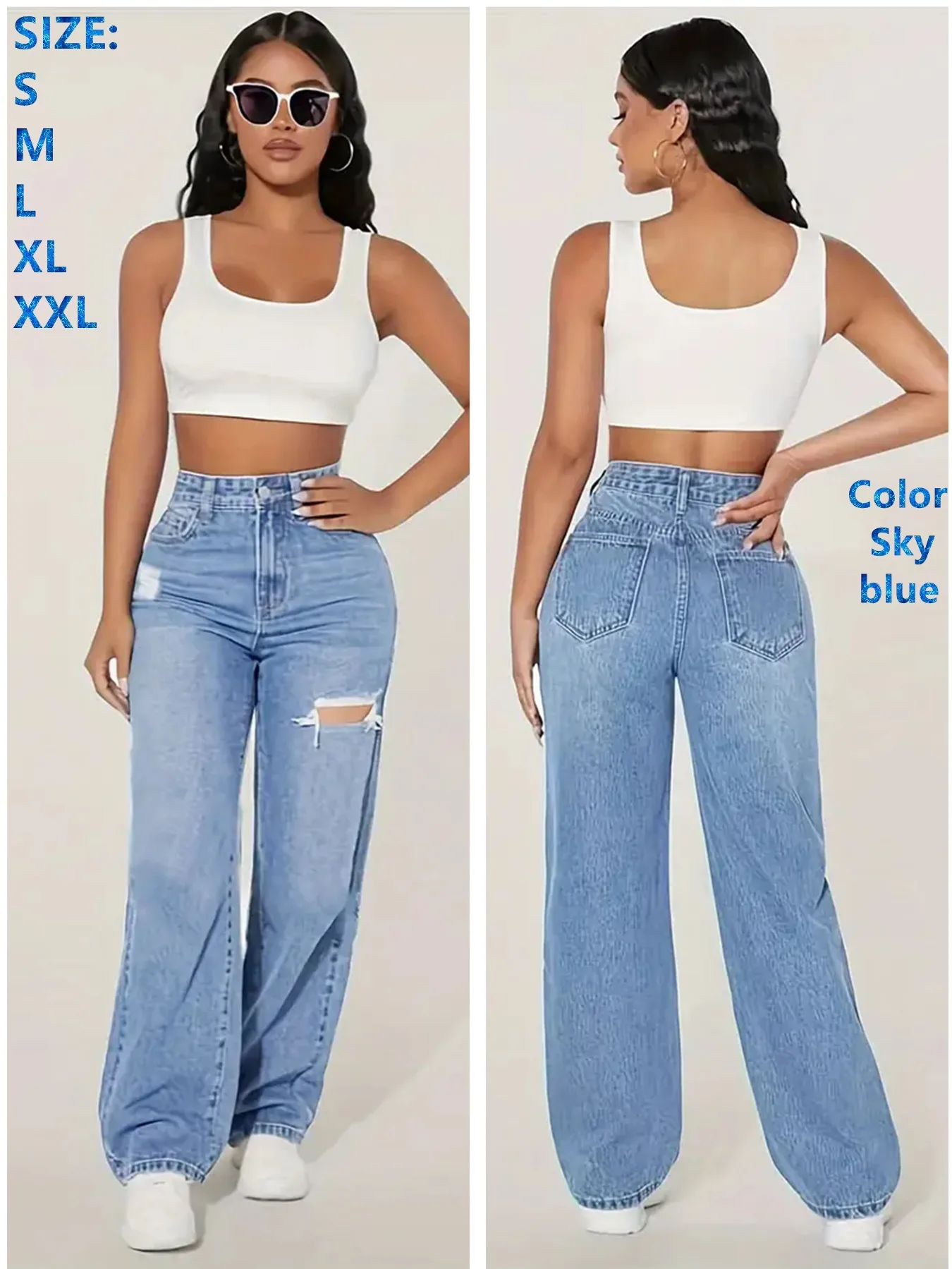 2025 Washed Ripped High-waisted Wide-leg Jeans. New Four Seasons Fashionable and Versatile Casual Floor-length Jeans for Women
